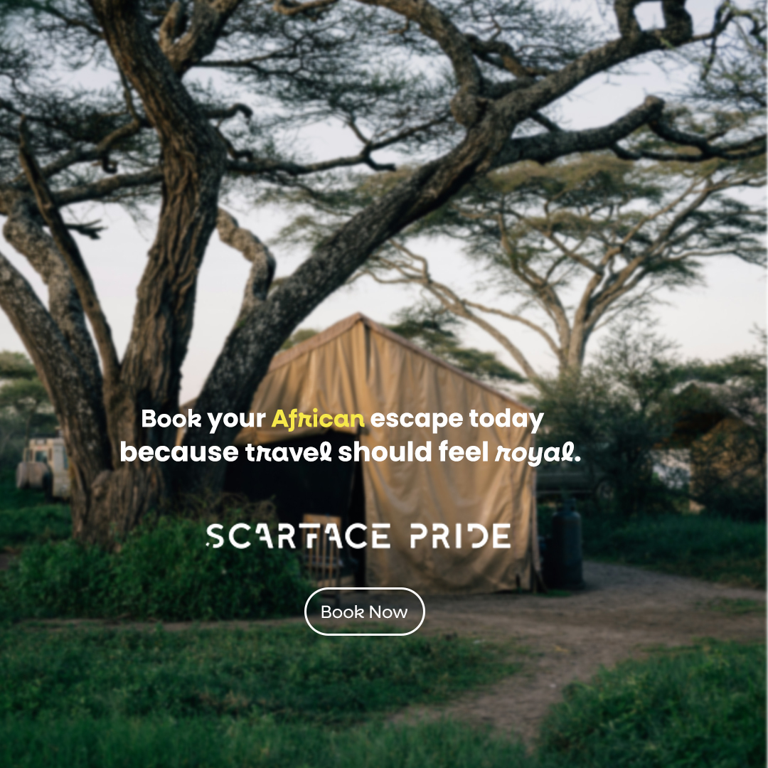 "An African safari isn’t just a holiday — it’s a story you live. With Scarface Pride, you travel like royalty, sleep like a native, and collect memories wild enough to brag about."